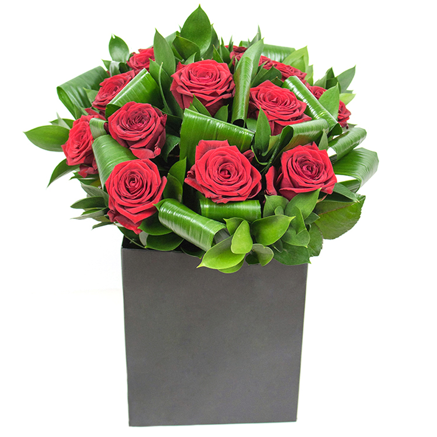 Introducing our stunning floral arrangement that combines luscious red roses, sophisticated aspidistra leaves, and verdant ruscus. This unique bouquet is perfect for adding elegance and charm to any setting.